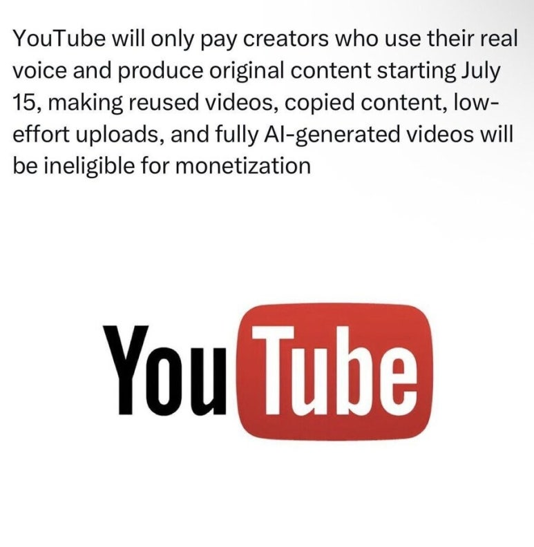 유튜브는 7월 15일부터 자신의 실제 목소리를 사용하고, 독창적인 콘텐츠를 제작하는 크리에이터에게만 수익을 지급할 예정입니다.