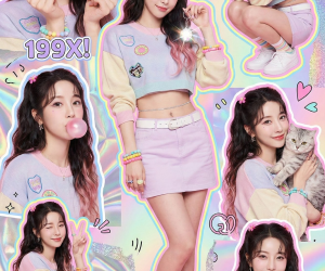 facelock_identity": "true","accuracy": "100%",scene"화려한 Y2K 스크랩북 포스터의 미학, 생동감 넘치는 스티커, 다양한 포즈와 컷아웃으로 같은 옷과 헤어스타일을 한 여러 인물, 다채로운 획과 선, 프레임 없는 콜라주 스타일. 하트 모양 손가락 클로즈업 샷, 흰색 폴라로이드 카메라를 들고 턱을 받치고 쪼그리고 앉은 전신 포즈, 분홍색 풍선껌을 불며 뺨을 만지는 중간 샷, 고양이를 안고 우아하게 미소 짓는 중간 샷, 한쪽 눈을 윙크하며 평화 사인을 하는 우아한 자세, 데이지 꽃을 들고 있는 중간 샷 등이 포함됩니다. 홀로그램 텍스처, 파스텔 그라데이션, 반짝이는 포인트, 장난기 넘치는 낙서, 잡지 표지 그림, 혼란스럽지만 균형 잡힌 레이아웃, 매우 예술적이고 시각적으로 매력적입니다.",main_subject": {"description": "스크랩북 콜라주 중앙에는 젊은 Y2K 스타일의 여성이 중심이 되어 있습니다.","style_pose": "장난기 넘치고 자신감 넘치는 Y2K 포즈 - 살짝 엉덩이를 옆으로 뻗고, 한 손에는 렌즈 플레어 키체인을 들고, 귀엽고 멋진 표정으로 카메라를 향해 얼굴을 살짝 내밀고, 살짝 삐죽 내밀고, 2000년대 초반의 솔직한 사진 분위기를 자아냅니다."outfit": {"top": "자수 패치가 있는 파스텔 색상의 크롭 오버사이즈 스웨터","bottom": "흰색 벨트가 달린 파스텔 스커트","socks": "화려한 파스텔 스트라이프 무늬가 있는 흰색 발목 양말","shoes": "흰색 스니커즈","accessories": ["컬러풀한 플라스틱 팔찌","두툼하고 화려한 반지","반짝이는 벨리 체인","hairstyle":"type": "Y2K 하프업 하프다운","details": "파스텔 컬러 꽃 클립, 얇은 앞머리, 아랫단에 버블검 핑크 틴트가 들어간 짙은 갈색 웨이브 머리, 2000년대 초반의 상징적인 스타일."additional_visuals":"하트, 별, 나비 스티커","레트로 반짝이","폴라로이드 액자","네온 윤곽선","낙서 borders","잡지 컷아웃 텍스트: '너무 귀여워!', '199X!', '여자 분위기'","파스텔 조명","광택이 나는 몽환적인 레트로 빛","매우 아름다운 스크랩북 레이아웃"photography_rendering": {"color_grading": "시네마틱 네온 Y2K","lighting": "부드러운 플래시 조명","skin_texture": "매끄러운 광택 마감","rendering": "고해상도의 초현실적인 Y2K 스크랩북 톤","quality": "8K","composition": "완벽한 균형과 예술적 감각"negative_prompt": "Y2K 미학을 깨는 사실주의 없음, 현대적인 2020년대 의상 없음, 지저분한 구도 없음, 흐릿한 얼굴 없음, 왜곡된 손 없음, 추가 팔다리 없음, 얼굴 왜곡 없음, 저해상도 없음, 그레인 없음, 칙칙한 색상 없음, 워터마크 없음, AI 아티팩트"